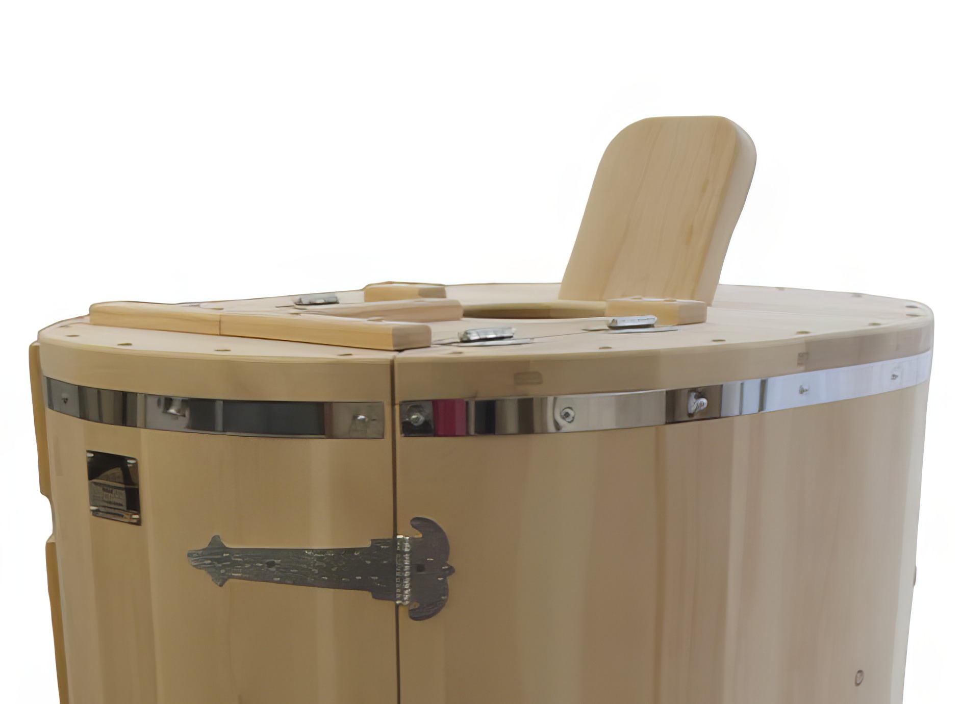 Готовый комплект - это полностью укомплектованный набор с фитобочкой для процедур парения. Овальная модель более просторна и удобна в использовании. Толщина стенок составляет 25 мм. Фитобочка оборудована откидными створками, дверцей и отверстием для головы. Во время парения человек сидит внутри кедровой бочки, а голова находится снаружи. Благодаря этому исключается возможность перегрева. Подлокотники из кедра, встроенные ручки на створках и двери делают эксплуатацию более удобной.
