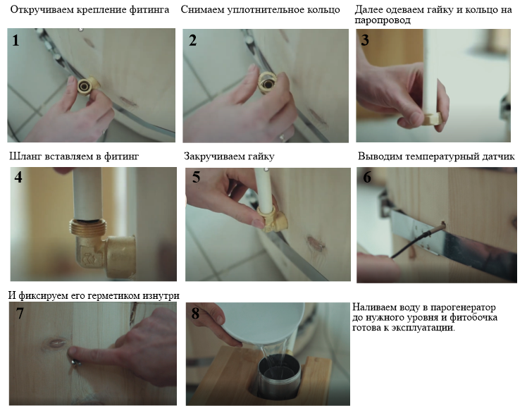 3. На дне любой фитобочки имеется разводка пара (исключением составляют бочки с китайским ПГН, в них нет разводки пара в классическом ее представлении), разводка пара имеет выход с внешней стороны фитобочки (отверстие диаметром 16 мм на высоте 10-15 см), к нему нужно присоединить один конец паропровода, второй конец соединяется с парогенератором. Паропровод должен располагаться от ПГН к изделию без перегибов.